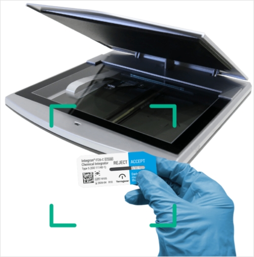 Rather than manually comparing the chemical indicator to a reference guide, it is placed in a Trazanto (a dedicated indicator card scanner), which automatically reads the image and gives the result. This dedicated physical scanner is ideal for use in sterile areas.