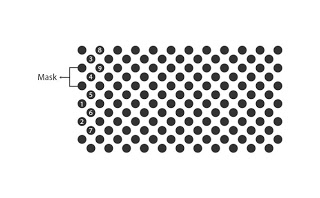 Uses a nine-dot pattern to represent a codeword. A printed dot represents one and an unprinted dot represents 0. For example, the codeword for character “A” is 33 and the dot pattern is 010010111.