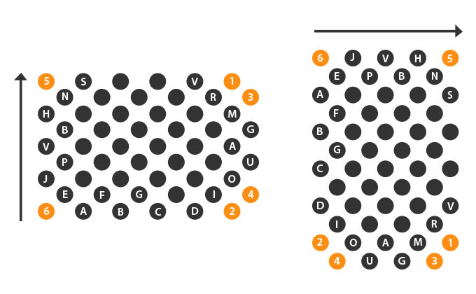 The edge containing two corner data dots determines the bitstream origin and direction. For a symbol with the two data dots along the W, the bitstream flows top to down. For a symbol with the two data dots along the H, the bitstream flows left to right.