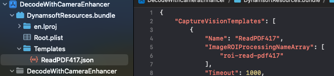 startCapturingorcapturemethod. The template name is the name ofCaptureVisionTemplatesin your template file (see in the image of step 3).- Objective-C