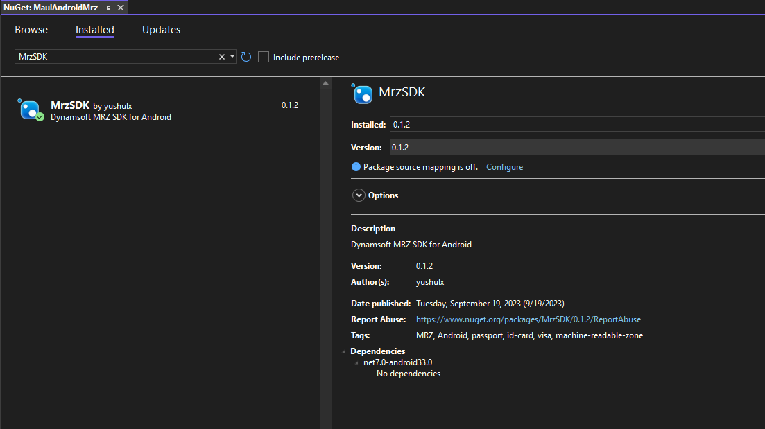 MrzSDKNuGet package is only available for Android. Thus. it is conditionally referenced in the.csprojfile as follows:<ItemGroup Condition="'$(TargetFramework)' == 'net7.0-android'"> <PackageReference Include="MrzSDK"> <Version>0.1.2</Version> </PackageReference> </ItemGroup> -