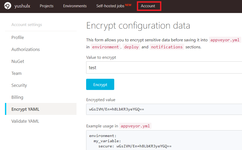 When adding tags to the GitHub repository, the APPVEYOR_REPO_TAG value will be `true’. You can encrypt the username and password of the PyPi account by clicking Account > Encrypt YAML.