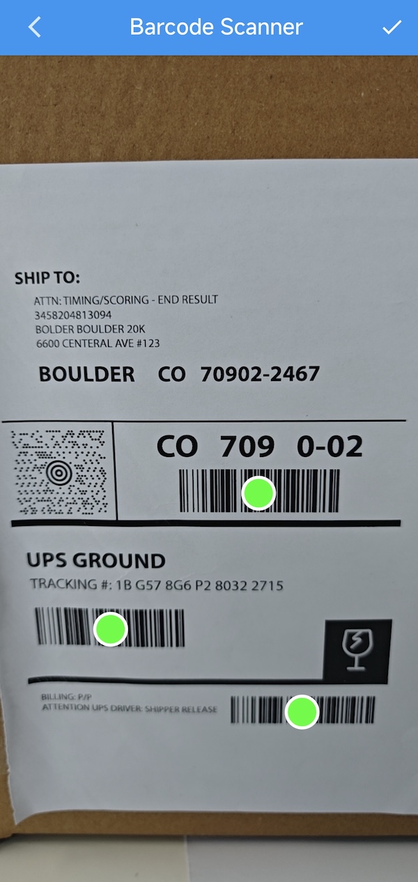 - Click the checkmark button to confirm the selected barcodes and return the results to the application.