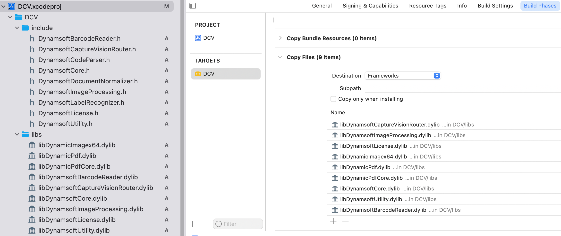 Build Phases>Copy Filesand add all the.dylibfiles to theFrameworkssection. -