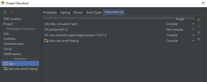Once clicked the “Finish” button, the aar file will be packaged into your Android project as a module. Press F4 to open Project Structure, and then add the dependent module:
