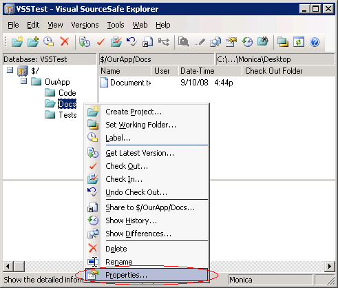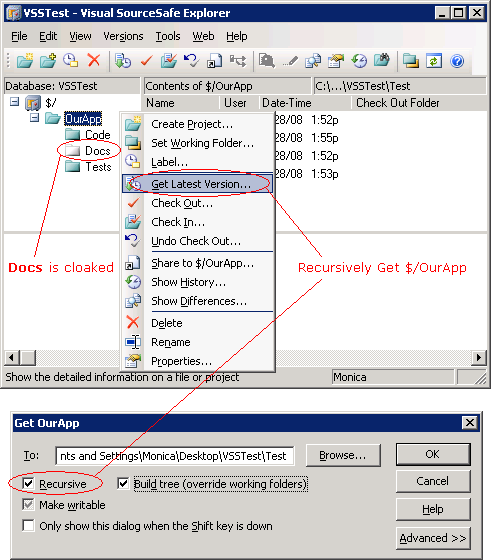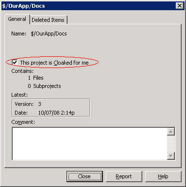 However, it does not mean that we cannot get a cloaked project. For example, if we want to get all the sub files and folders in the $/OurApp/Docs project which is cloaked, we can make the focus on the project (like clicking on the project) and then perform Get operation.