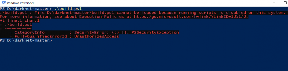 If the PowerShell script file fails to run, you need to re-open PowerShell as administrator and change the security policy: