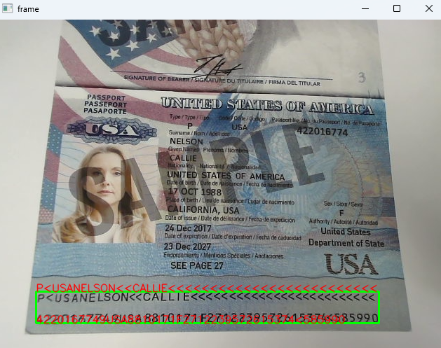 Scanning and recognizing MRZ in real-time via webcam requires capturing a continuous image stream. We can use the OpenCV library to capture frames from the webcam and process them with the Dynamsoft Capture Vision SDK. The following code snippet demonstrates how to implement real-time MRZ recognition using a webcam: