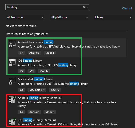 When searching for binding in Visual Studio 2022, you will see there are two kinds of library binding projects. One for Xamarin, and the other for .NET 6. To build .NET MAUI-compatible librayr, we select the project templates without (Xamarin).