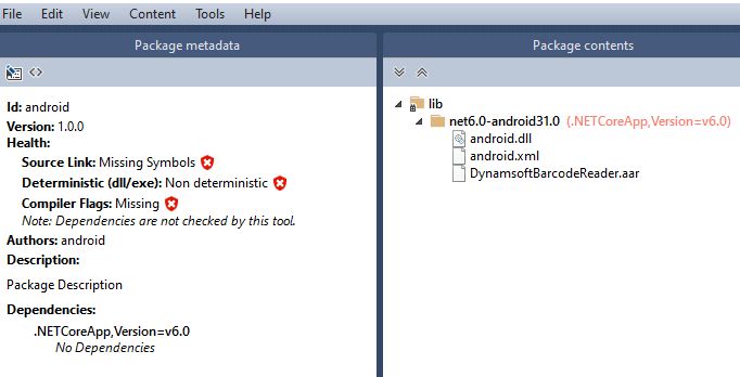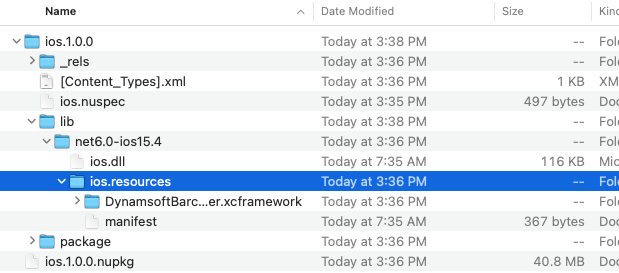 Packto create the NuGet package. Now you will see the difference between Windows and macOS. The output package generated by Visual Studio for Windows only containsios.dll. In contrast, the package generate by Visual Studio for macOS containsios.dll,manifestandDynamsoftBarcodeReader.xcframework. Apparently, the package built on Windows cannot work. But don’t worry, according to the structure of the package built on macOS, we can construct a workable package on Windows.