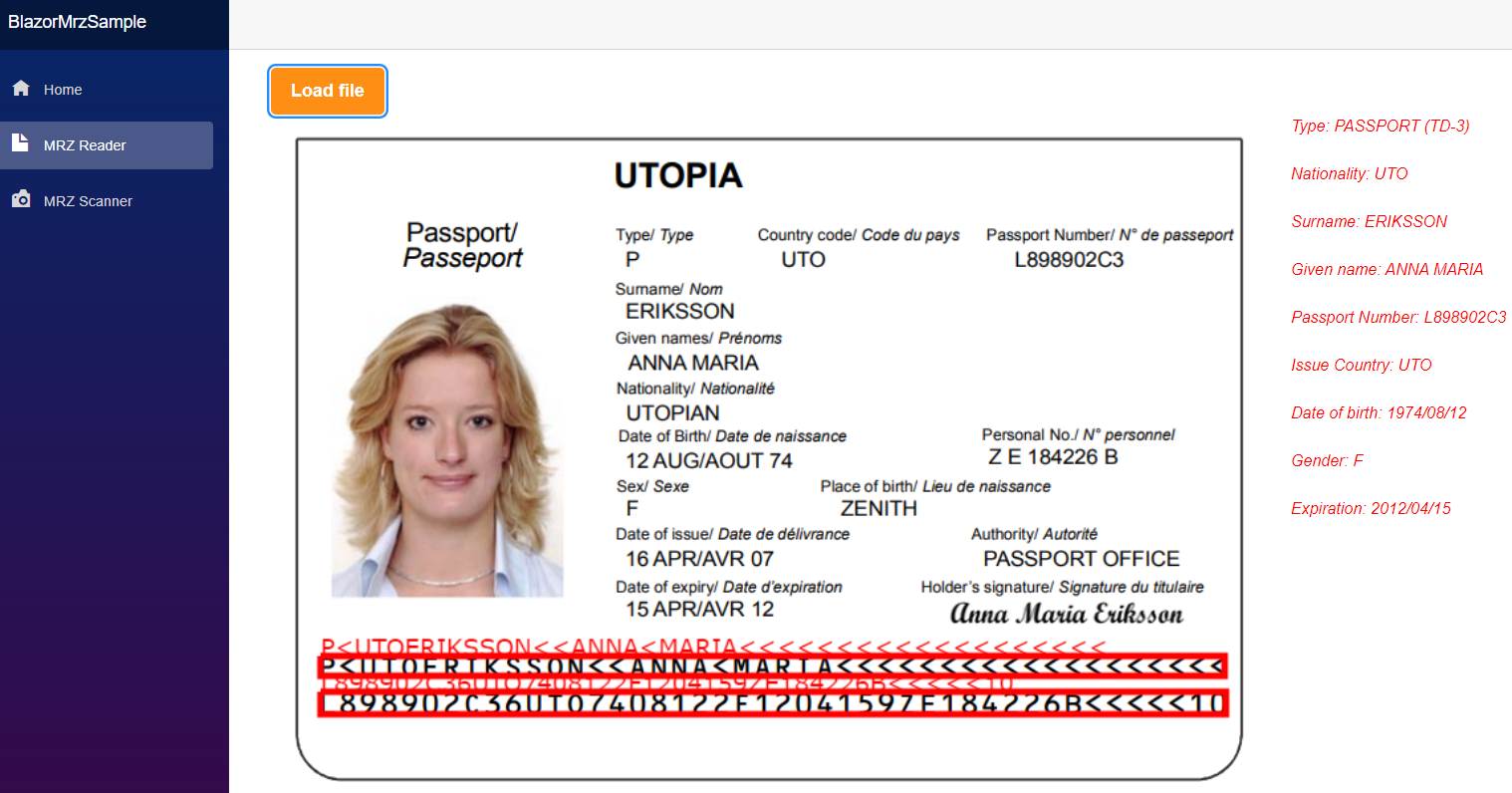 Run and Test the MRZ Reader: Run the Blazor application and navigate to the MRZ Reader page.