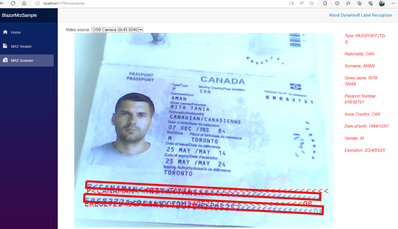 Run and Test the MRZ Scanner: Run the Blazor application and navigate to the MRZ Scanner page.