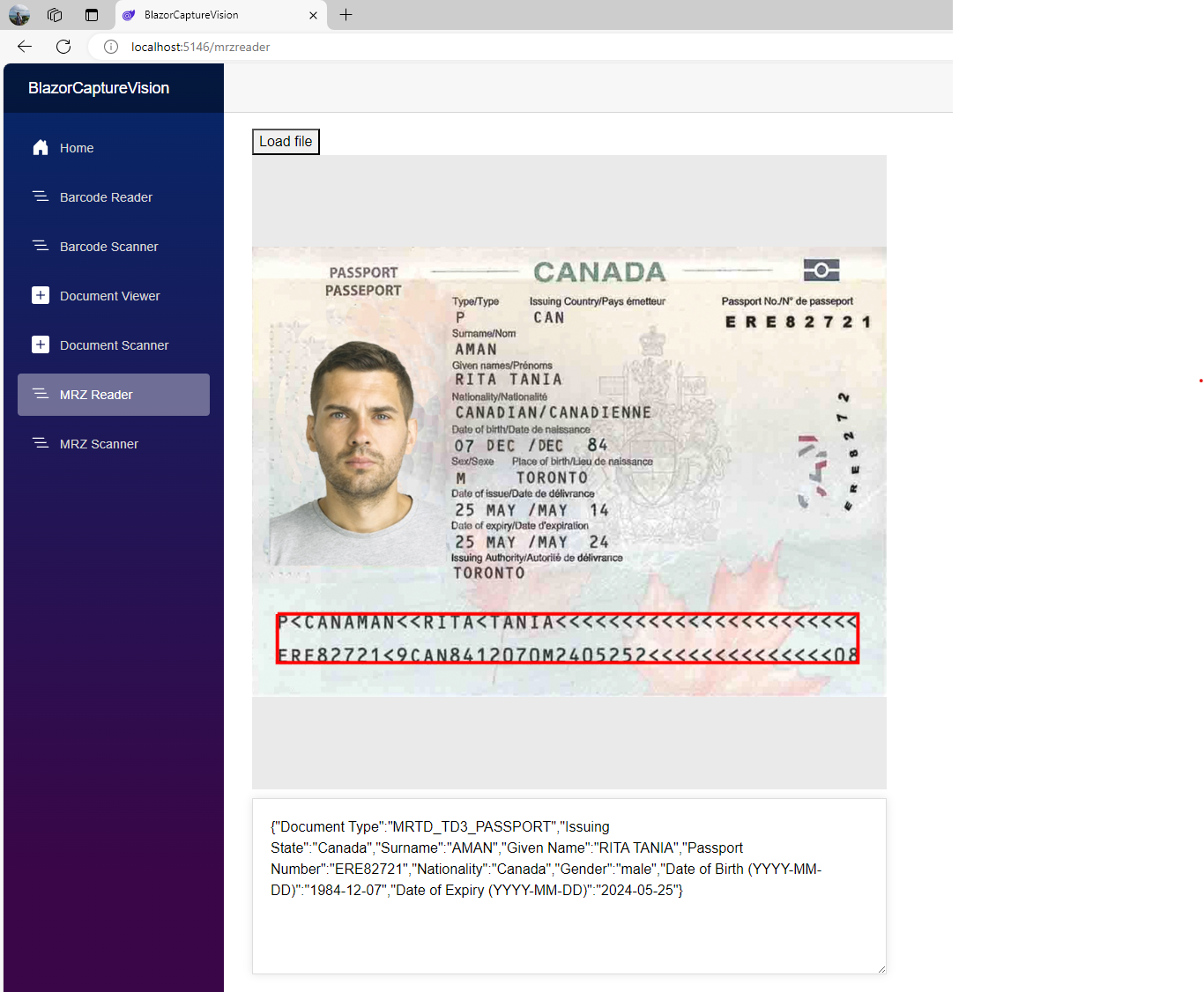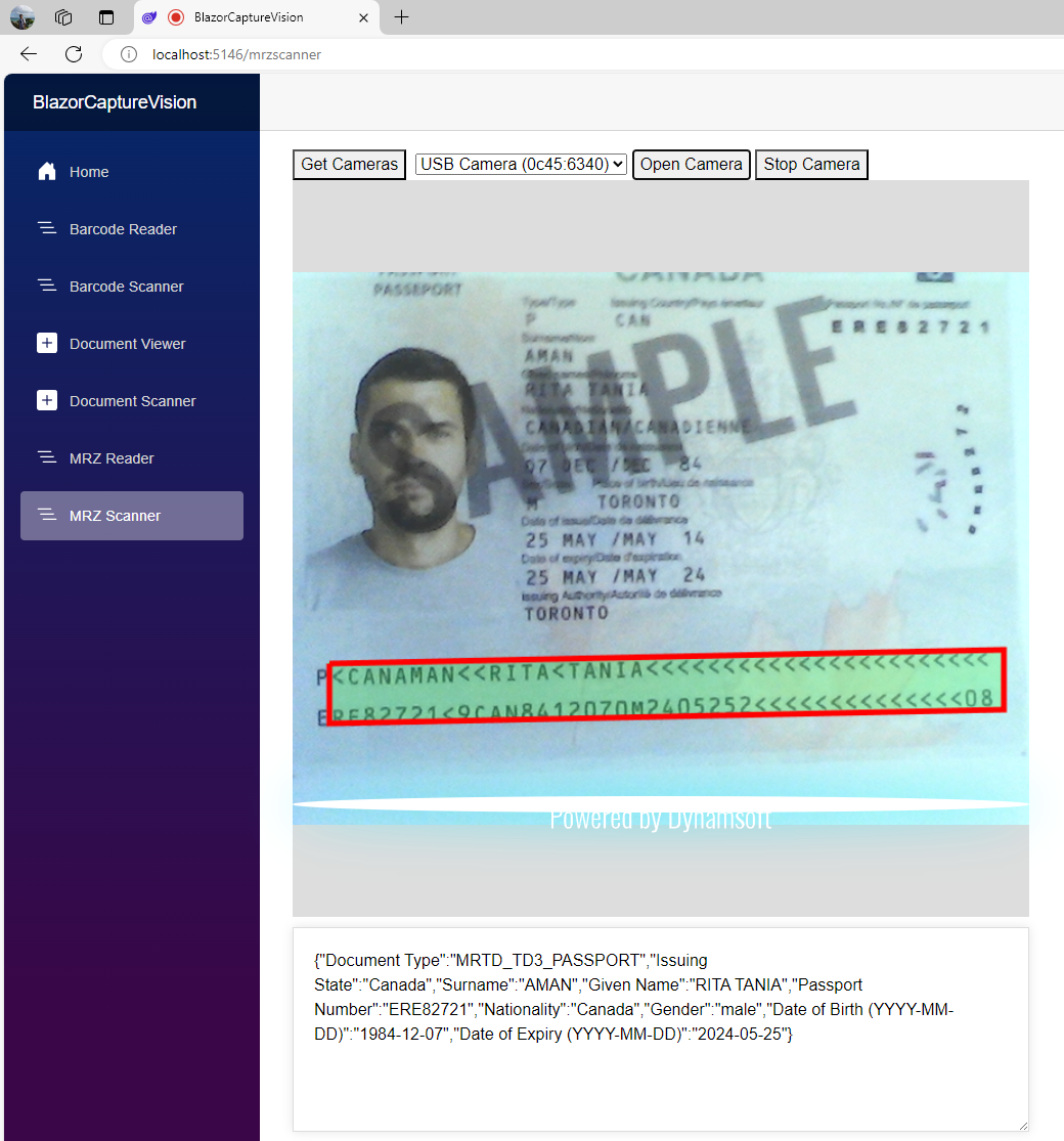 4. Run and Test the MRZ Scanner: Run the Blazor application and navigate to the MRZ Scanner page.
