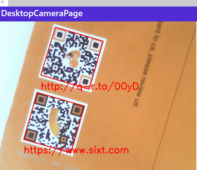 Cv2.DrawContoursandCv2.PutText:if (results != null) { foreach (BarcodeQRCodeReader.Result result in results) { int[] points = result.Points; if (points != null) { OpenCvSharp.Point[] all = new OpenCvSharp.Point[4]; int xMin = points[0], yMax = points[1]; all[0] = new OpenCvSharp.Point(xMin, yMax); for (int i = 2; i < 7; i += 2) { int x = points[i]; int y = points[i + 1]; OpenCvSharp.Point p = new OpenCvSharp.Point(x, y); xMin = x < xMin ? x : xMin; yMax = y > yMax ? y : yMax; all[i / 2] = p; } OpenCvSharp.Point[][] contours = new OpenCvSharp.Point[][] { all }; Cv2.DrawContours(mat, contours, 0, new Scalar(0, 0, 255), 2); if (result.Text != null) Cv2.PutText(mat, result.Text, new OpenCvSharp.Point(xMin, yMax), HersheyFonts.HersheySimplex, 1, new Scalar(0, 0, 255), 2); } } } -