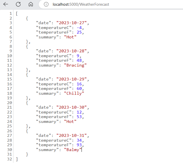 Now, run dotnet run to start the app, then open your browser and go to http://localhost:5000/WeatherForecast. If you see the following response, the app is functioning as expected:
