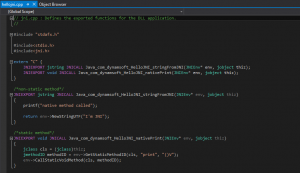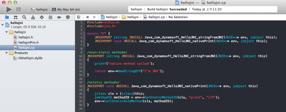 Eclipse will automatically compile the source code into a class file. Use javah to generate a C header file NativeBarcodeReader.h from the class in the jni folder.