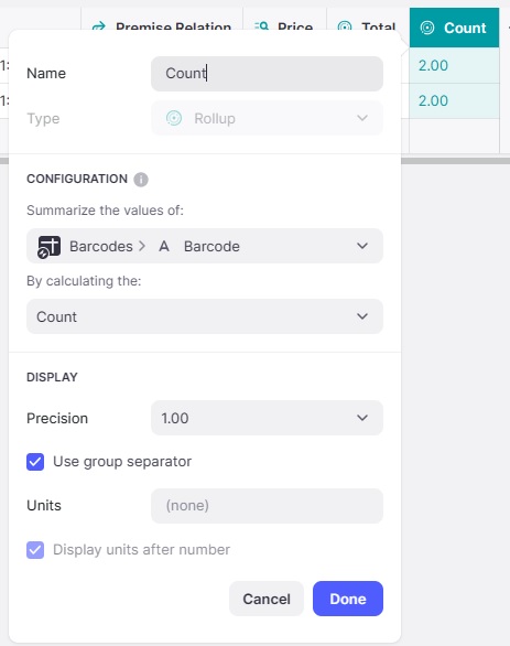 Barcodestable, create a new computed column whose type is “rollup” to calculate the total number of barcodes.