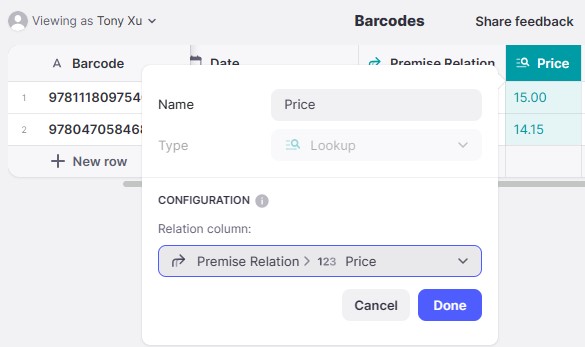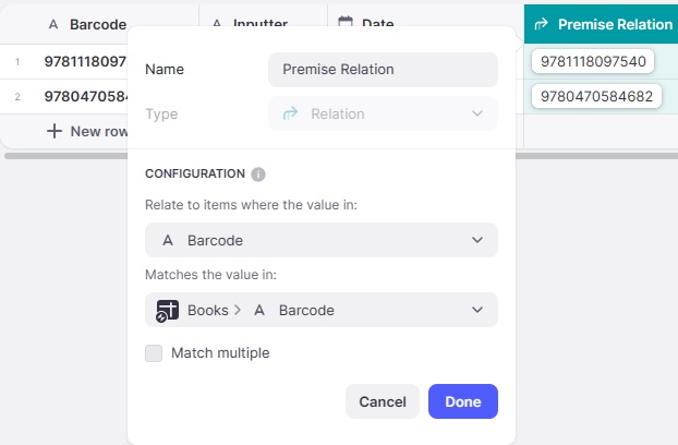 Barcodestable, create a new computed column whose type is “relation” to match the row in theBookstable by the barcode.