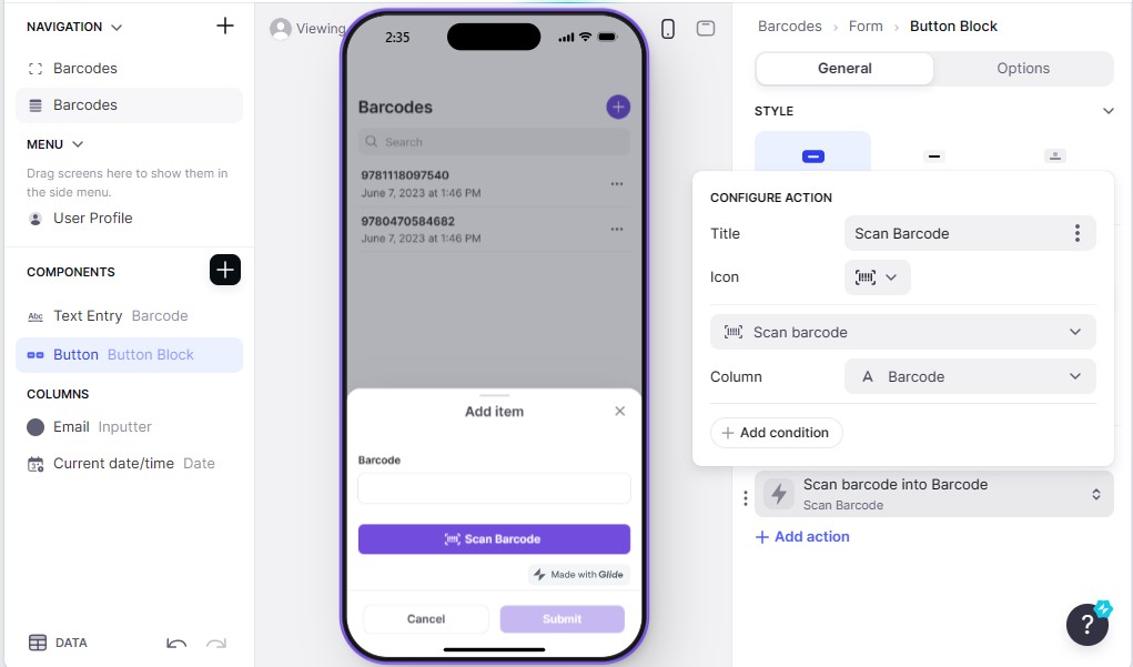 When the button is clicked, it will call the barcode scanner and save the detected barcode to the barcode column.