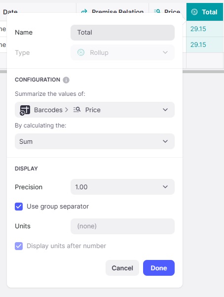Barcodestable, create a new computed column whose type is “rollup” to calculate the total price.