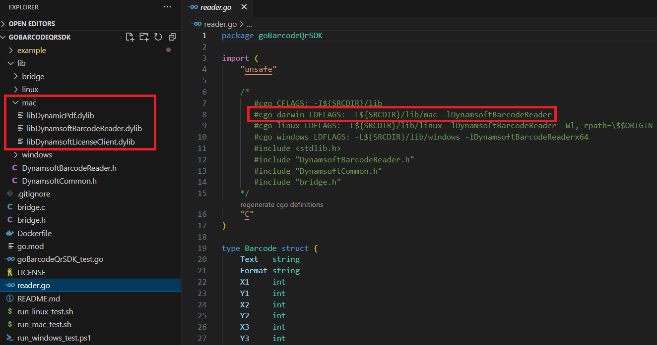 reader.gofile, define macOS-specificLDFLAGSusing cgo. Usedarwinas the Go build tag to target macOS environments.package barcode import ( "unsafe" /* #cgo darwin LDFLAGS: -L${SRCDIR}/lib/mac -lDynamsoftBarcodeReader ... */ "C" )