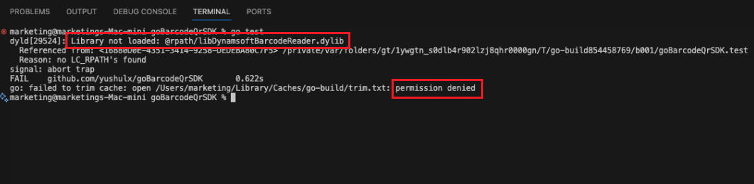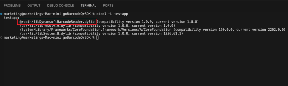 otoolcommand to inspect the library search path of the Go test binary.otool -L testapp testapp: @rpath/libDynamsoftBarcodeReader.dylib ...