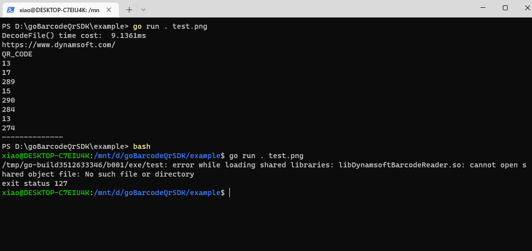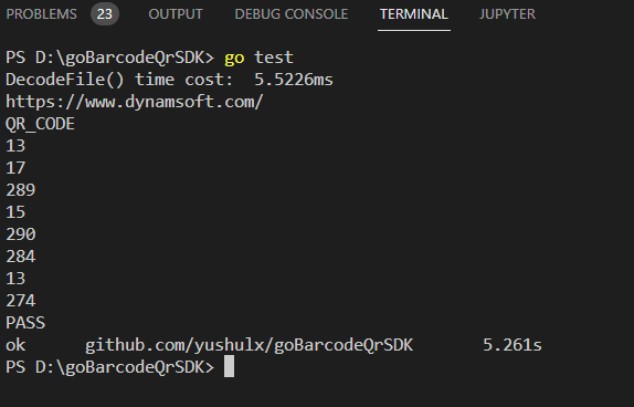 test.gofile and add the following code:package main import ( "fmt" "os" "time" "github.com/yushulx/goBarcodeQrSDK" ) func main() { filename := "test.png" license := "LICENSE-KEY" template := "template.json" ret, errMsg := goBarcodeQrSDK.InitLicense(license) if ret != 0 { fmt.Println(`initLicense(): `, ret) fmt.Println(errMsg) return } obj := goBarcodeQrSDK.CreateBarcodeReader() ret, errMsg = obj.LoadTemplateFile(template) if ret != 0 { fmt.Println(`LoadTemplateFile(): `, ret) fmt.Println(errMsg) } startTime := time.Now() ret, barcodes := obj.DecodeFile(filename) elapsed := time.Since(startTime) fmt.Println("DecodeFile() time cost: ", elapsed) if ret != 0 { fmt.Printf(`DecodeFile() = %d`, ret) } for i := 0; i < len(barcodes); i++ { barcode := barcodes[i] fmt.Println(barcode.Text) fmt.Println(barcode.Format) fmt.Println(barcode.X1) fmt.Println(barcode.Y1) fmt.Println(barcode.X2) fmt.Println(barcode.Y2) fmt.Println(barcode.X3) fmt.Println(barcode.Y3) fmt.Println(barcode.X4) fmt.Println(barcode.Y4) fmt.Println("--------------") } }Remember to substitute