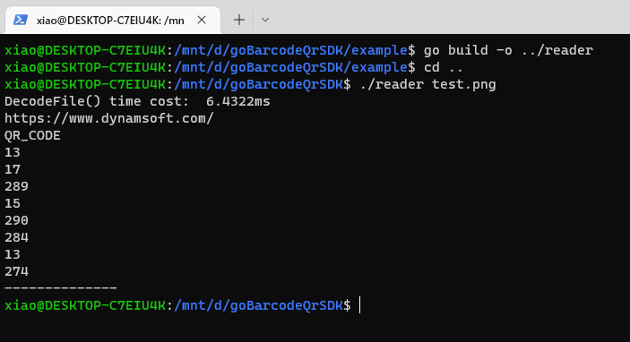 goBarcodeQrSDKdirectory, create two files:bridge.handbridge.c. These files are designed to facilitate data conversion between the Dynamsoft Barcode SDK and Go, streamlining the integration process.bridge.h:#include <stdio.h> #include <stdlib.h> #include "DynamsoftBarcodeReader.h" TextResult *getTextResultPointer(TextResultArray *resultArray, int offset); LocalizationResult *getLocalizationPointer(TextResult *result); const char *getText(TextResult *result); const char *getFormatString(TextResult *result);bridge.c:#include "bridge.h" TextResult *getTextResultPointer(TextResultArray *resultArray, int offset) { return resultArray->results[offset]; } LocalizationResult *getLocalizationPointer(TextResult *result) { return result->localizationResult; } const char *getText(TextResult *result) { return result->barcodeText; } const char *getFormatString(TextResult *result) { return result->barcodeFormatString; }