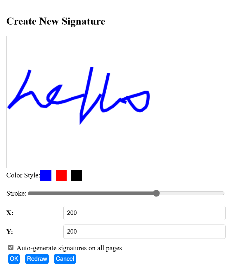 OK,Redraw, andCancelbuttons:const signatureOKButton = document.getElementById('signatureOK'); const signatureRedrawButton = document.getElementById('signatureRedraw'); const signatureCancelButton = document.getElementById('signatureCancel'); signatureOKButton.addEventListener('click', async () => { ... }); signatureRedrawButton.addEventListener('click', async () => { drawingHistory = []; redrawCanvas(); }); signatureCancelButton.addEventListener('click', async () => { document.getElementById("signature-input").style.display = "none"; });