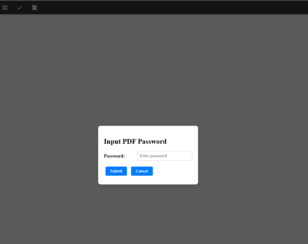 index.html:<div id="password-input" class="overlay"> <div class="popup"> <h2>Input PDF Password</h2> <form id="passwordForm"> <div class="form-group"> <label for="password">Password:</label> <input type="password" id="pdfpassword" name="pdfpassword" placeholder="Enter password" required> </div> <div class="popup-buttons"> <button type="button" id="submitPassword">Submit</button> <button type="button" id="cancelPassword">Cancel</button> </div> </form> </div> </div> -