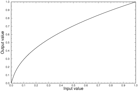 where A is a constant and the input and output values are non-negative real values; in the common case of A = 1, inputs and outputs are typically in the range 0–1. A gamma value γ < 1 is sometimes called an encoding gamma, and the process of encoding with this compressive power-law nonlinearity is called gamma compression; conversely a gamma value γ > 1 is called a decoding gamma and the application of the expansive power-law nonlinearity is called gamma expansion.”