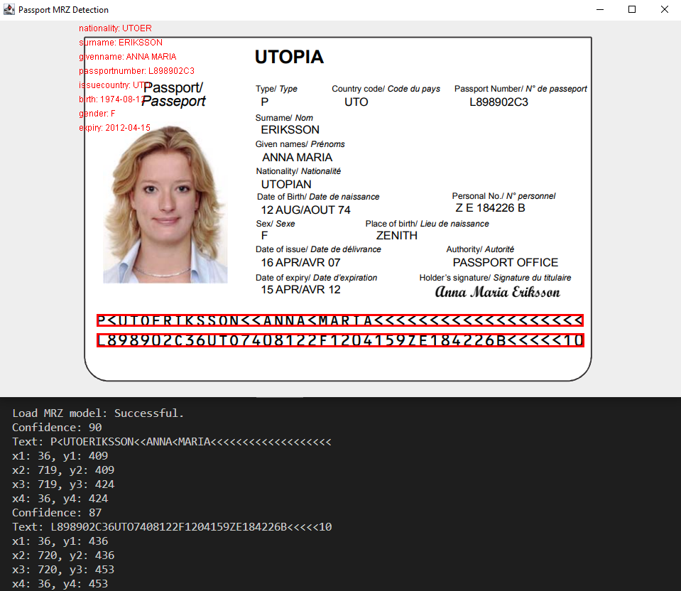 specified in the JSON-formatted template file according to the extraction path of the Jar package. Gson can be used to load and update the JSON object.public int loadModel() throws IOException { String modeFile = "MRZ.json"; String tempFolder = new File(System.getProperty("java.io.tmpdir")).getAbsolutePath(); String targetPath = new File(tempFolder, modeFile).getAbsolutePath(); // Modify the model path based on your own environment FileReader reader = new FileReader(targetPath); char[] chars = new char[1024]; int len = 0; StringBuilder sb = new StringBuilder(); while ((len = reader.read(chars)) != -1) { sb.append(new String(chars, 0, len)); } String template = sb.toString(); if (reader != null) { reader.close(); } Gson gson = new Gson(); JsonObject jsonObject = gson.fromJson(template, JsonObject.class); JsonArray array = jsonObject.get("CharacterModelArray").getAsJsonArray(); JsonObject object = array.get(0).getAsJsonObject(); String modelPath = object.get("DirectoryPath").getAsString(); if (modelPath != null && modelPath.contains("model")) { object.addProperty("DirectoryPath", tempFolder); } FileWriter writer = new FileWriter(targetPath); writer.write(jsonObject.toString()); writer.flush(); writer.close(); return nativeLoadModel(nativePtr, targetPath); } NativeLoader.javais a utility class to extract MRZ OCR model files and C++ shared library files from the Jar package, as well as load the native libraries. All assets will be extracted to the temporary directory of users’ operating system. MD5 checksum is used to compare the file changes.private static boolean extractResourceFiles(String dlrNativeLibraryPath, String dlrNativeLibraryName, String tempFolder) throws IOException { String[] filenames = null; if (Utils.isWindows()) { filenames = new String[] {"DynamsoftLicenseClientx64.dll", "vcomp140.dll", "DynamicPdfx64.dll", "DynamsoftLabelRecognizerx64.dll", "dlr.dll"}; } else if (Utils.isLinux()) { filenames = new String[] {"libDynamicPdf.so", "libDynamsoftLicenseClient.so", "libDynamsoftLabelRecognizer.so", "libdlr.so"}; } boolean ret = true; for (String file : filenames) { ret &= extractAndLoadLibraryFile(dlrNativeLibraryPath, file, tempFolder); } // Extract model files String modelPath = "/model"; filenames = new String[] {"MRZ.json", "MRZ.caffemodel", "MRZ.txt", "MRZ.prototxt"}; for (String file : filenames) { ret &= extractAndLoadLibraryFile(modelPath, file, tempFolder); } return ret; } static String md5sum(InputStream input) throws IOException { BufferedInputStream in = new BufferedInputStream(input); try { MessageDigest digest = java.security.MessageDigest.getInstance("MD5"); DigestInputStream digestInputStream = new DigestInputStream(in, digest); for (; digestInputStream.read() >= 0;) { } ByteArrayOutputStream md5out = new ByteArrayOutputStream(); md5out.write(digest.digest()); return md5out.toString(); } catch (NoSuchAlgorithmException e) { throw new IllegalStateException("MD5 algorithm is not available: " + e); } finally { in.close(); } }MrzResult.javais a Java class to store the MRZ detection results, including detection confidence, text, and coordinates.public class MrzResult { public int confidence; public String text; public int x1, y1, x2, y2, x3, y3, x4, y4; public MrzResult(int confidence, String text, int x1, int y1, int x2, int y2, int x3, int y3, int x4, int y4) { this.confidence = confidence; this.text = text; this.x1 = x1; this.y1 = y1; this.x2 = x2; this.y2 = y2; this.x3 = x3; this.y3 = y3; this.x4 = x4; this.y4 = y4; } }MrzParser.javais a Java class to parse the MRZ detection results and decode the MRZ information. The MRZ information includes the document type, issuing country, document number, date of birth, and expiration date, which are stored in acom.google.gson.JsonObjectobject.JsonObject mrzInfo = new JsonObject(); ... // Get issuing State infomation String nation = line1.substring(2, 7); pattern = Pattern.compile("[0-9]"); matcher = pattern.matcher(nation); if (matcher.matches()) return null; if (nation.charAt(nation.length() - 1) == '<') { nation = nation.substring(0, 2); } mrzInfo.addProperty("nationality", nation); // Get surname information line1 = line1.substring(5); int pos = line1.indexOf("<<"); String surName = line1.substring(0, pos); pattern = Pattern.compile("[0-9]"); matcher = pattern.matcher(surName); if (matcher.matches()) return null; surName = surName.replace("<", " "); mrzInfo.addProperty("surname", surName); // Get givenname information String givenName = line1.substring(surName.length() + 2); pattern = Pattern.compile("[0-9]"); matcher = pattern.matcher(givenName); if (matcher.matches()) return null; givenName = givenName.replace("<", " "); givenName = givenName.trim(); mrzInfo.addProperty("givenname", givenName); // Get passport number information String passportNumber = ""; passportNumber = line2.substring(0, 9); passportNumber = passportNumber.replace("<", " "); mrzInfo.addProperty("passportnumber", passportNumber); ...