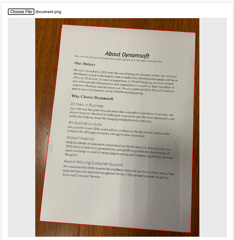 <div class="container" id="file_container"> <div> <input type="file" id="pick_file" accept="image/*" /> <button onclick="detect()">Detect</button> </div> <div class="row"> <div class="imageview"> <img id="image_file" src="default.png" /> <canvas id="overlay_canvas" class="overlay"></canvas> </div> </div> <div class="row"> <div> <textarea id="detection_result"></textarea> </div> </div> <div class="row"> <div> <img id="document-rectified-image" /> </div> </div> </div> -
