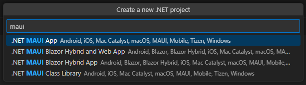 Ctrl+Shift+Pto open the command palette and run theCreate a new .NET MAUI Appcommand to scaffold a new .NET MAUI project.