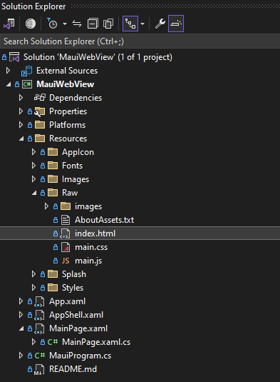 In a .NET MAUI project, you can load static HTML, JavaScript, and CSS files located in the Resources/Raw folder into the WebView. Ensure that the MauiAsset build action is included in the .csproj file: