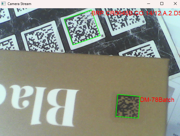 app.jsand add the following code:const dbr = require('barcode4nodejs'); dbr.initLicense("LICENSE-KEY"); var litecam = require('litecam'); const nodecamera = new litecam.NodeCam(); console.log(litecam.getDeviceList()); var isWorking = false; let results = null; async function decode(buffer, width, height) { if (isWorking) { return; } isWorking = true; results = await dbr.decodeBufferAsync(buffer, width, height, width * 3, dbr.formats.ALL, ""); isWorking = false; } function show() { if (nodecamera.waitKey('q')) { let frame = nodecamera.captureFrame(); if (frame) { nodecamera.showFrame(frame['width'], frame['height'], frame['data']); decode(frame['data'], frame['width'], frame['height']); if (results) { for (let i = 0; i < results.length; i++) { result = results[i]; let contour_points = [[result['x1'], result['y1']], [result['x2'], result['y2']], [result['x3'], result['y3']], [result['x4'], result['y4']]]; nodecamera.drawContour(contour_points) nodecamera.drawText(result['value'], result['x1'], result['y1'], 24, [255, 0, 0]) } } } setTimeout(show, 30); } else { nodecamera.release(); } } if (nodecamera.open(0)) { let mediaTypes = nodecamera.listMediaTypes(); console.log(mediaTypes); nodecamera.createWindow(nodecamera.getWidth(), nodecamera.getHeight(), "Camera Stream"); show(); }Replace