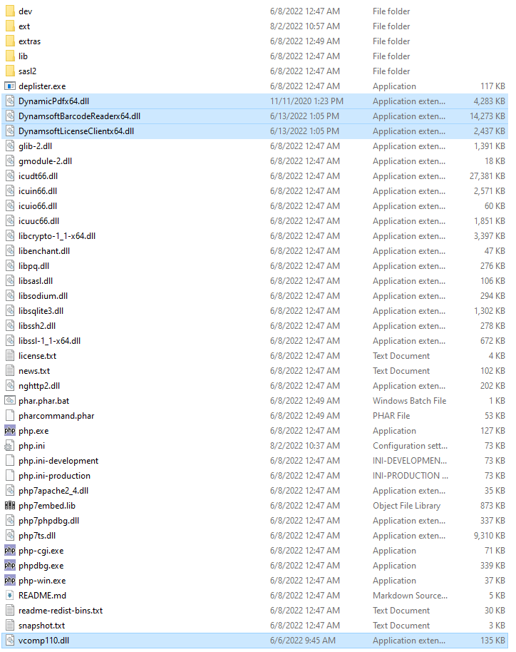 2. Copy the generated php_dbr.dll to the php/ext/ folder, and also copy DynamicPdfx64.dll, DynamsoftBarcodeReaderx64.dll, DynamsoftLicenseClientx64.dll and vcomp110.dll to the PHP root directory.