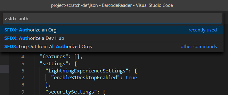In Visual Studio Code, press Ctrl+Shift+P and type “sfdx: create project” to create a new project named BarcodeReader: