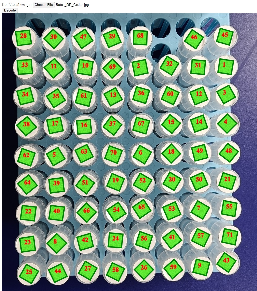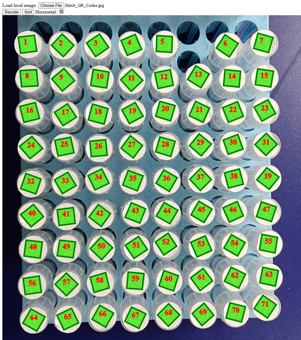 The tubes may be used for Covid-19 PCR test. They need to be retrieved in reading order (from left to right and line by line from the top to bottom). It would be convenient if we can scan all the barcodes, sort the results and output the results to CSV files for further use.