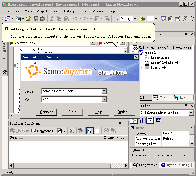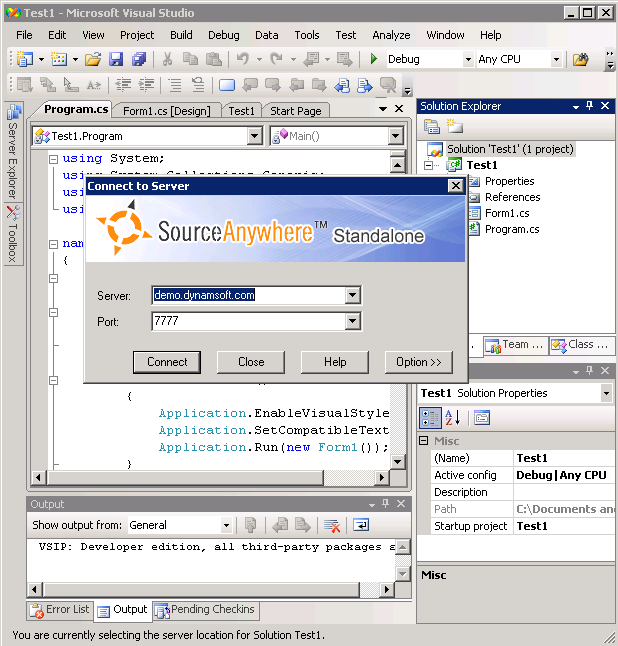 Now the solution is in the source control of SourceAnywhere Standalone. And next time you open the solution, Visual Studio will prompt the Login dialog box of SourceAnywhere Standalone to connect to the server.