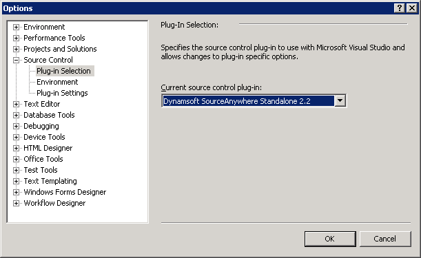 Select SourceAnywhere Standalone as the current source control plug-in through Visual Studio menu Tools -> Options -> Source Control.