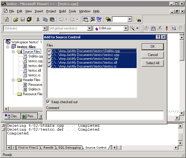 - For Visual Studio 6.0, right-click the files and click Add to Source Control or click menu Project -> Source Control -> Add to Source Control.