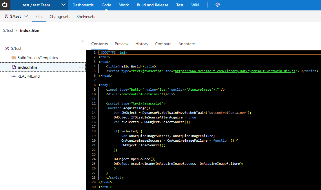 Visit https://{youraccount}.visualstudio.com/test/_versionControl and you will see the file.