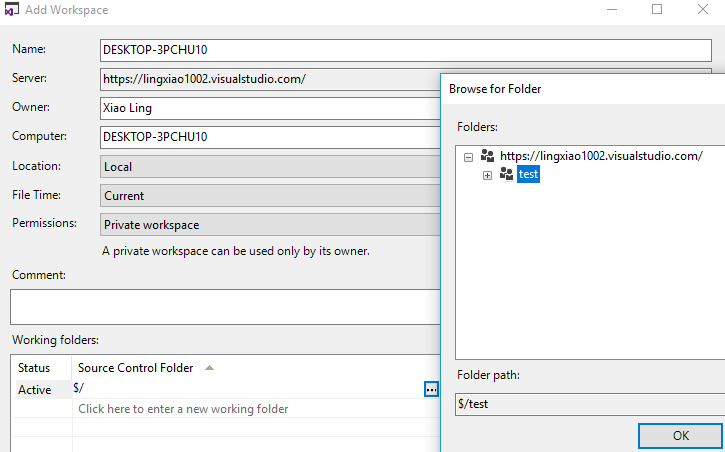 tf workspace /new /collection:https://{ youraccount }.visualstudio.com/