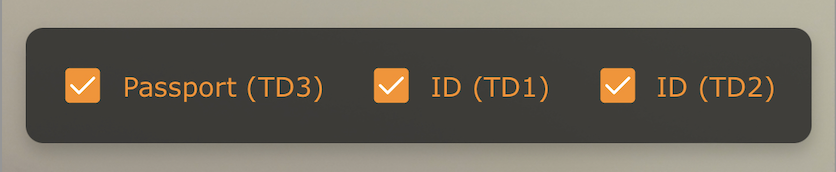 Format Selector: Below the scan guide frame, you will also notice a selector box that allows the user to choose which formats the MRZ Scanner should recognize. The formats that show up in the format selector are configurable via the