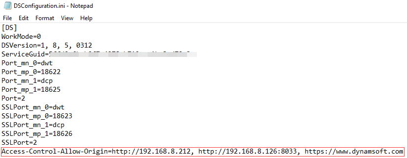For security purposes, you may want the Dynamic Web TWAIN Service to only respond to requests from specified origins. Starting from Dynamic Web TWAIN version 18.5, this can be achieved by adding Access-Control-Allow-Origin in the DSConfiguration.ini file.
