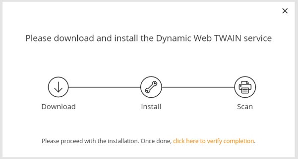 Once the installation is done, the users can click the orange sentence ‘click here to verify completion’ or refresh the page to start using Dynamic Web TWAIN.
