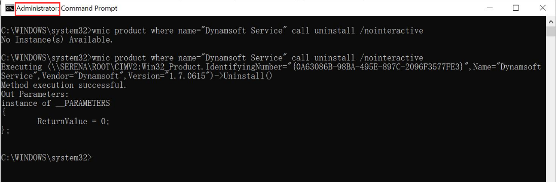 wmic product where name="Dynamsoft Service" call uninstall /nointeractive